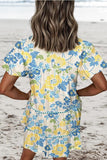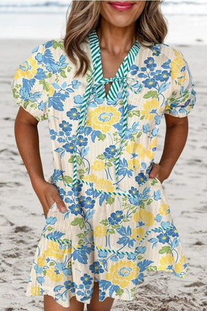 Step out in style in the Aapparella Floral Striped Trim Puff Short Sleeve Dress. This fashionable dress features a lovely blue floral print and coordinating striped trim for a bold and chic look. With its flattering puff sleeves and feminine design, this dress is perfect for any occasion.