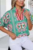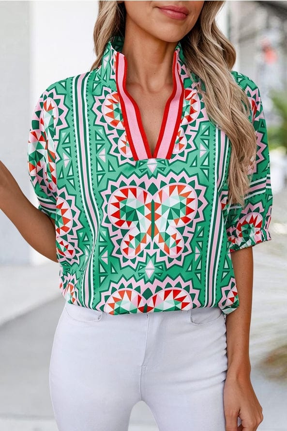 Add a touch of elegance to your wardrobe with the Aapparella Geometric Butterfly Print Collared Blouse. The pretty Summery light green and pink colors will elevate any outfit, making you look fashionable and stylish. Don't miss out on this must-have piece for any ladies looking for a unique and trendy top.