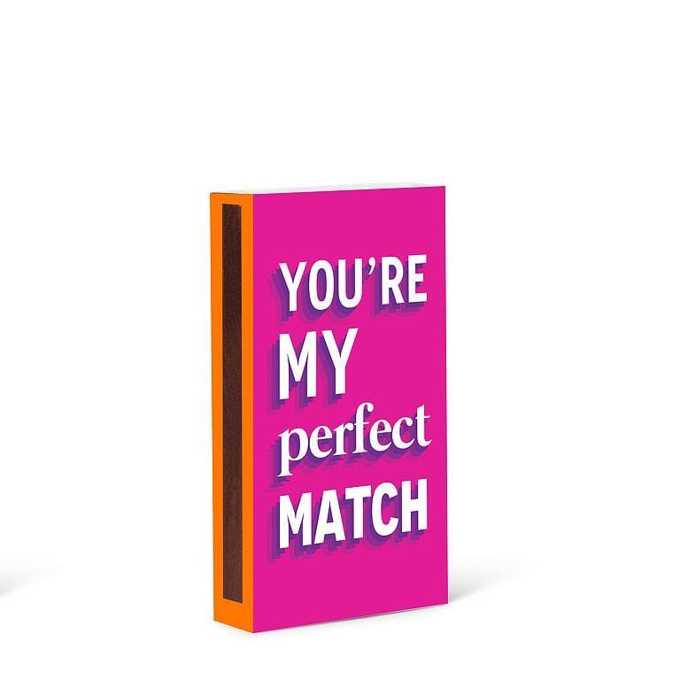 Spark some conversation and a fire with this fun "Perfect Match" Matchbox. An Abbott Exclusive, this colourful matchbox complements its pink and yellow covers with cheeky and suggestive phrases and song lyrics, along with 45 wooden matches to keep any fire burning all night long. Each matchbox includes 45 wooden matchsticks with coordinating match-tip colour, and makes a great add-on to tealights and candles. 20-STRIKE-TEXT-03
