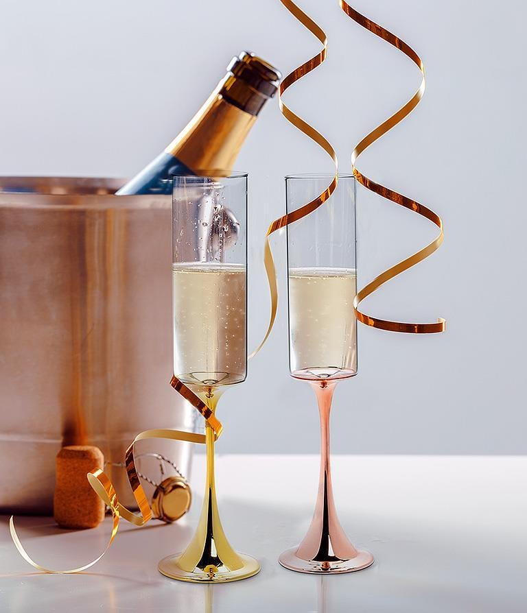 Set the mood for any party with this elegant Slender Flute in Gold. Crafted from glass with a gold-colored stem, this stylish entertaining accessory is sure to elevate any occasion. Also available in other colors and styles. 9.5"H. Each glass sold separately.