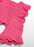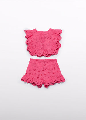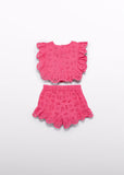 Indulge your little princess in the epitome of luxury with the Baby Girl Fuchsia Eyelet Short Set. Featuring delicate ruffle scallop trim and intricate eyelet detailing, this spring ensemble will make her the belle of any occasion. Let her shine in this elegantly crafted outfit.