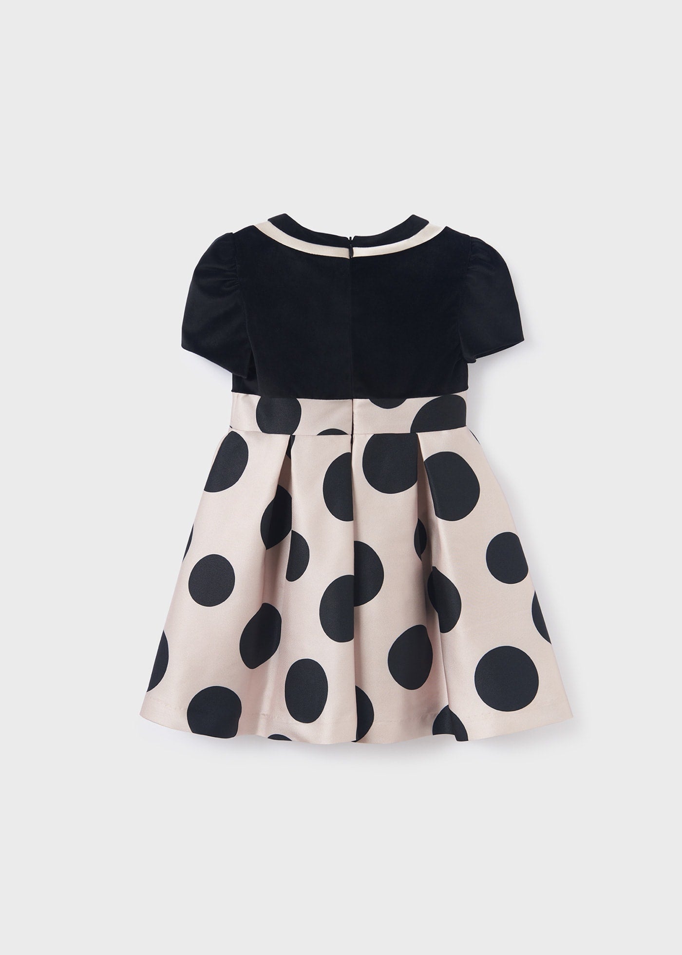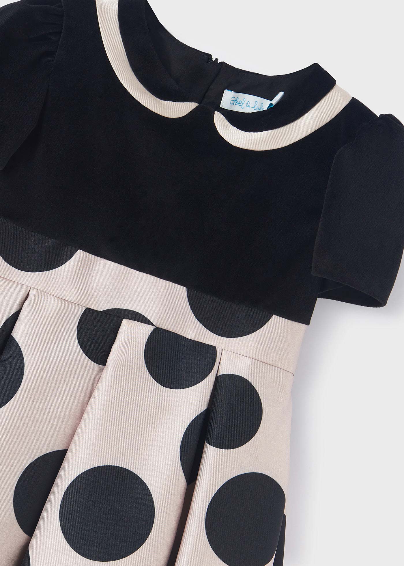 This Abel & Lula polka dot Mikado dress is a perfect pick for your young girl's party look. Crafted with 100% Polyester for the outside and 85% Cotton 15% Polyester lining, it features a beige skirt with large black polka dots and a hidden invisible zipper. The quality fabric and classic style ensure a comfortable and stylish fit.