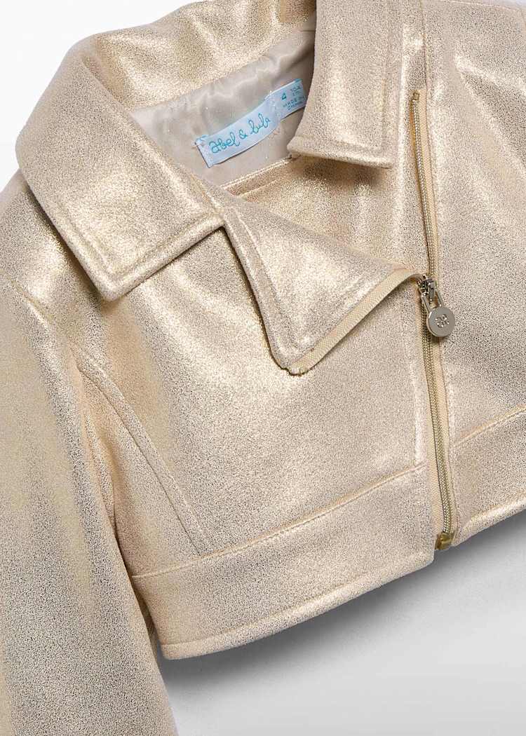 This Abel & Lula Vegan Leather jacket is a stylish addition to any girl's wardrobe. Made with 100% polyester outside and lining, this golden cropped jacket is also vegan, making it both fashionable and ethical. Complete with a sleek zip-up front, it's perfect for any occasion.