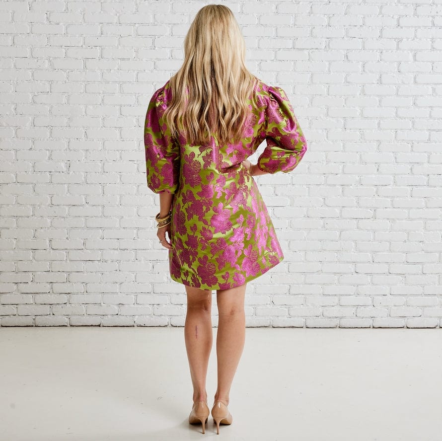 Caryn Lawn Asher Jacquard Dress brings holiday elegance with its eye-catching floral jacquard pattern. This 36" fan-favorite dress is designed to make you stand out at seasonal gatherings. The festive chartreuse and pink fabric creates a sophisticated silhouette that's perfect for special occasions. Dry clean only.