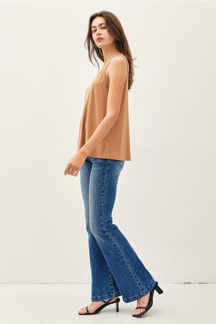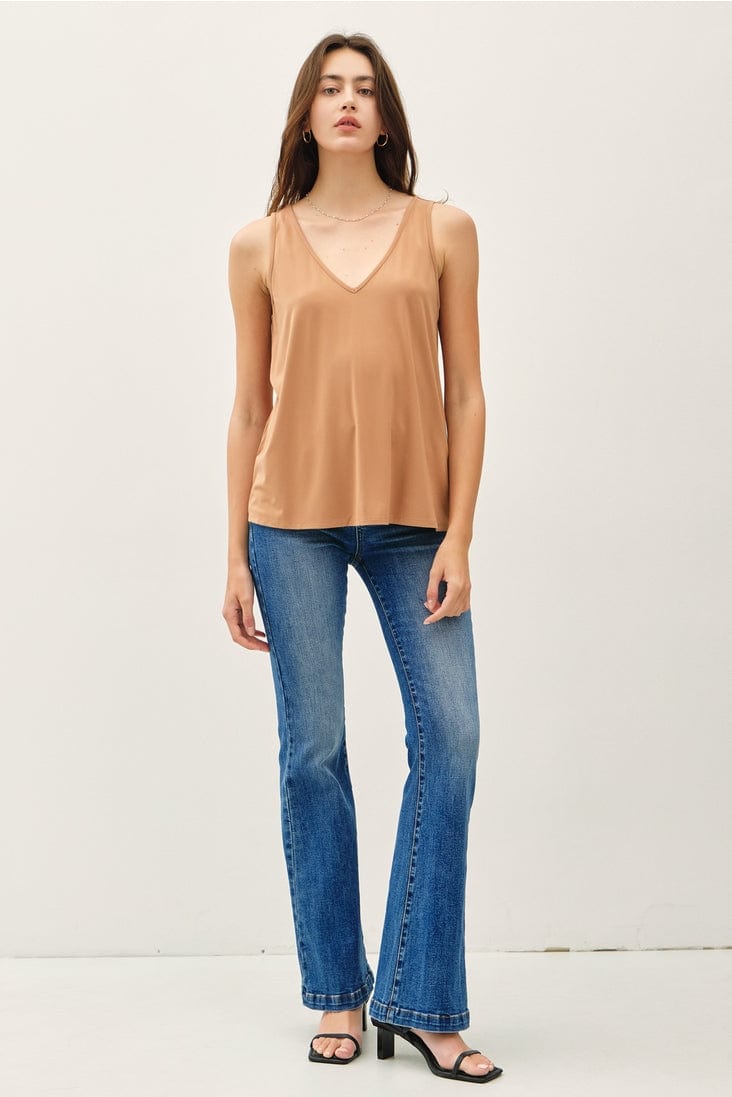 This Be Cool cork color sleeveless ladies tank features a flattering v-neckline on both front and back. Made from a luxurious blend of bamboo and modal fibers with a touch of spandex for stretch, it feels cool against your skin and incredibly soft to the touch. The relaxed fit makes this essential basic perfect for everyday wear, whether layered or on its own.