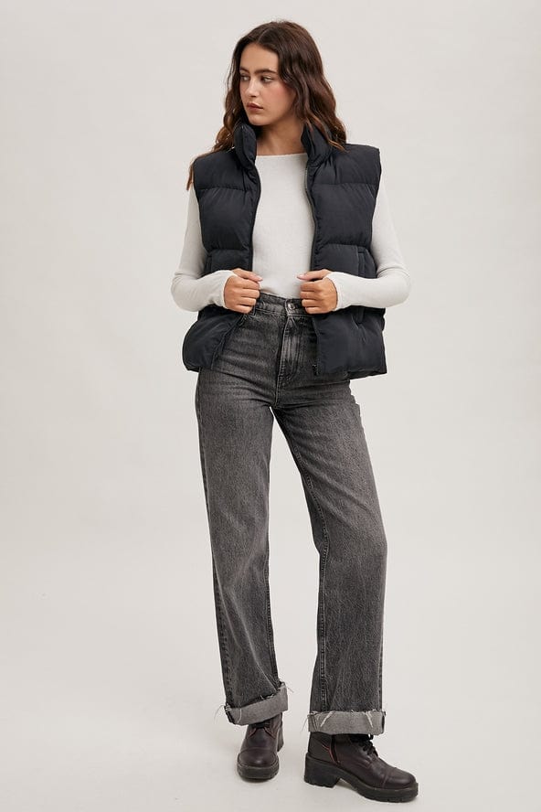 Zipper front puffer vest with pockets. This practical and stylish vest features a front zipper closure and convenient pockets, making it perfect for layering. The puffer design provides warmth and comfort, while the sleek silhouette ensures a modern look. Ideal for chilly days, this versatile vest can be worn over sweaters, hoodies, or long-sleeve shirts for added warmth and style. -Model is 5'9" and wearing a Small.