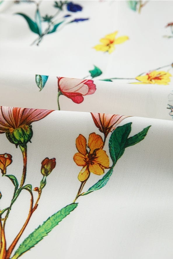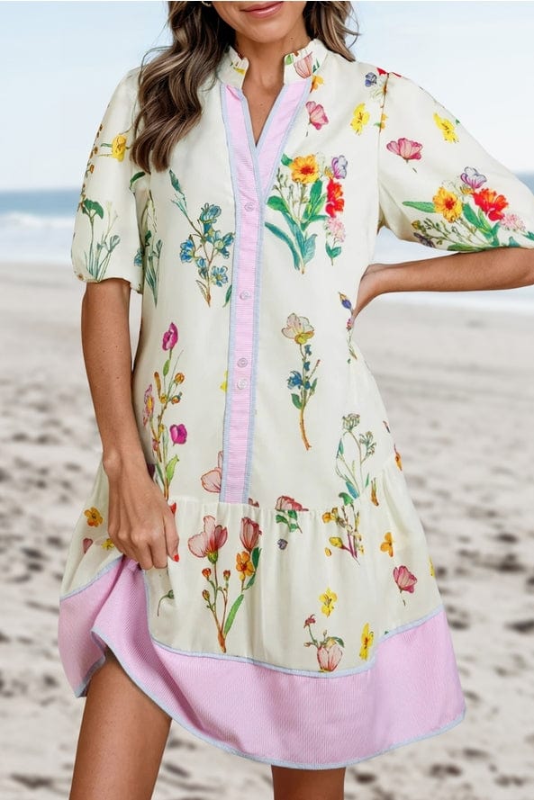 This lightweight mini dress features a feminine v-neck design with delicate floral patterns and a distinctive pink stripe accent along the center and hemline. The short sleeves and bohemian-inspired print create a stylish, easy-to-wear option perfect for casual outings or summer gatherings.