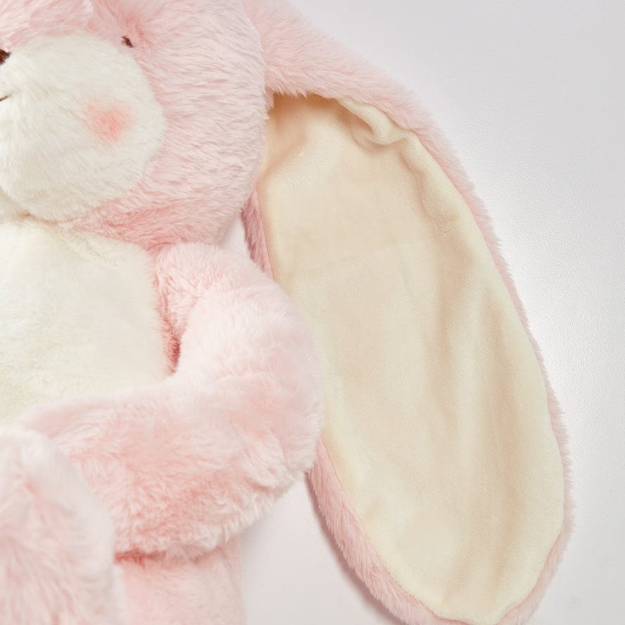 16" bunny, made to be loved luxurious contrasting fur and velour lined ears Embroidered features Safe for all ages 100% polyester This stuffed animal is surface clean only. Sweet, tender and oh-my-gosh unbelievably soft. Hand embroidered face, pink cheeks, and big fluffy tail. Rosewater pink and warm white fur, with velour lined ears. Timeless and classic, this plush bunny will surely bring you glad dreams!
