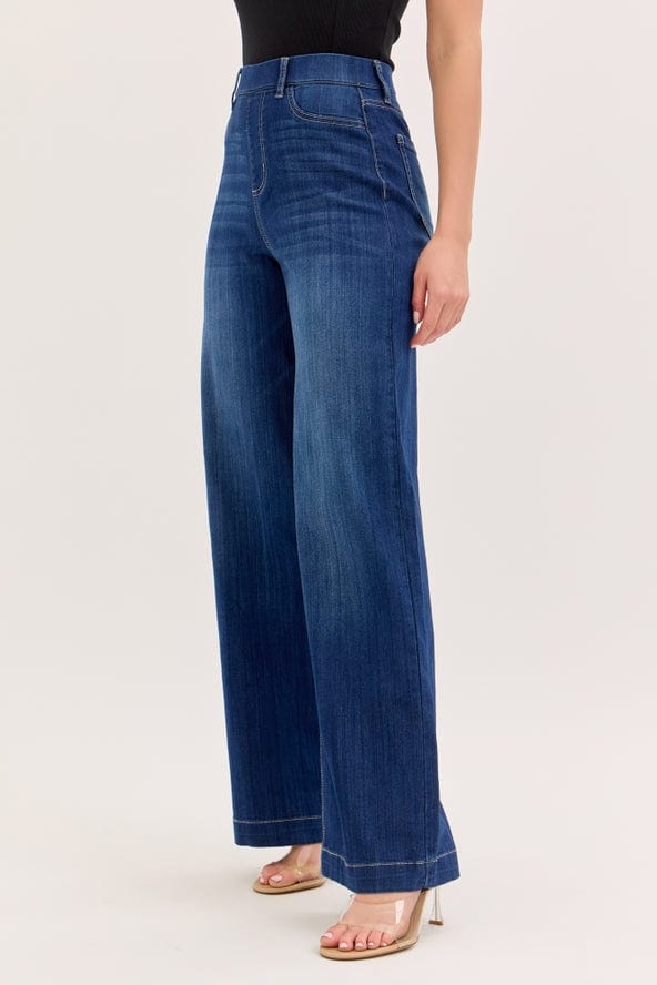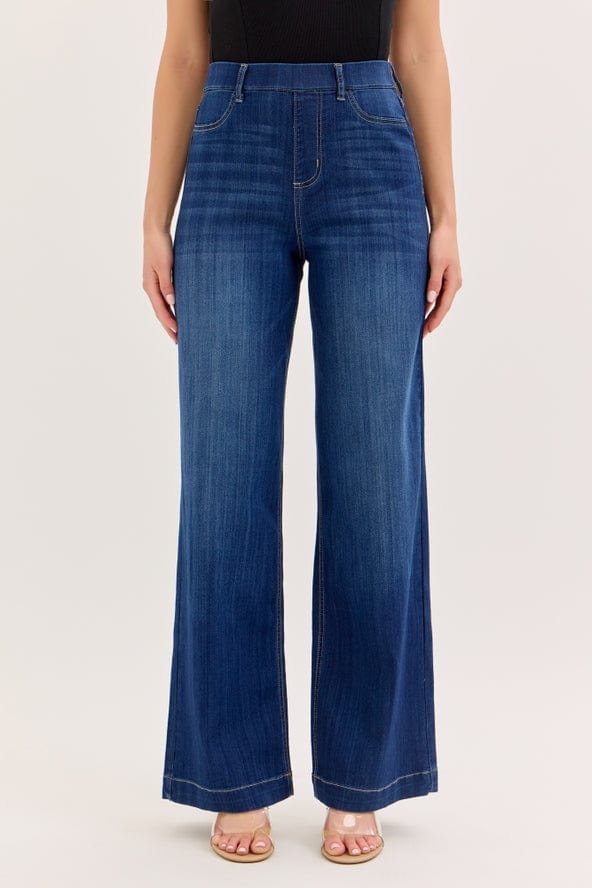 These Cello Jeans classic high-rise jeans come in an everyday dark denim wash with a soft flexible fabrication and a wide-leg fit. High-Rise Pull-On Wide leg in Dark Denim