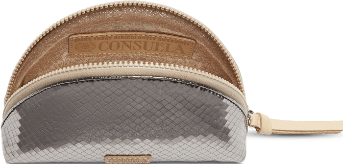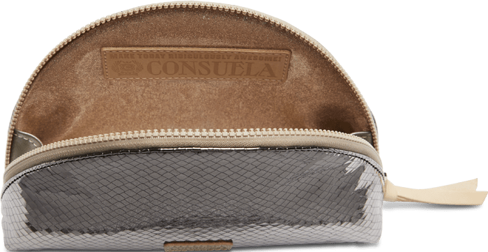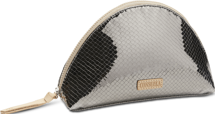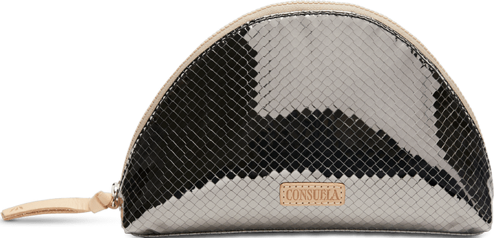 Stay organized with the Consuela Kyle Cosmetic Bag. The gunmetal-textured synthetic exterior provides protection while organizing your makeup, skincare, and other essential items. Durably designed with a natural leather zipper and pull for easy access. A perfect addition for keeping your items safely stored. Medium - 7 ¼” (W) x 4 ½” (H) x 2 ¾” (D) Large - 9 ¾” (W) x 6” (H) x 3”(D)