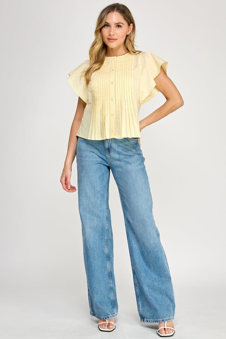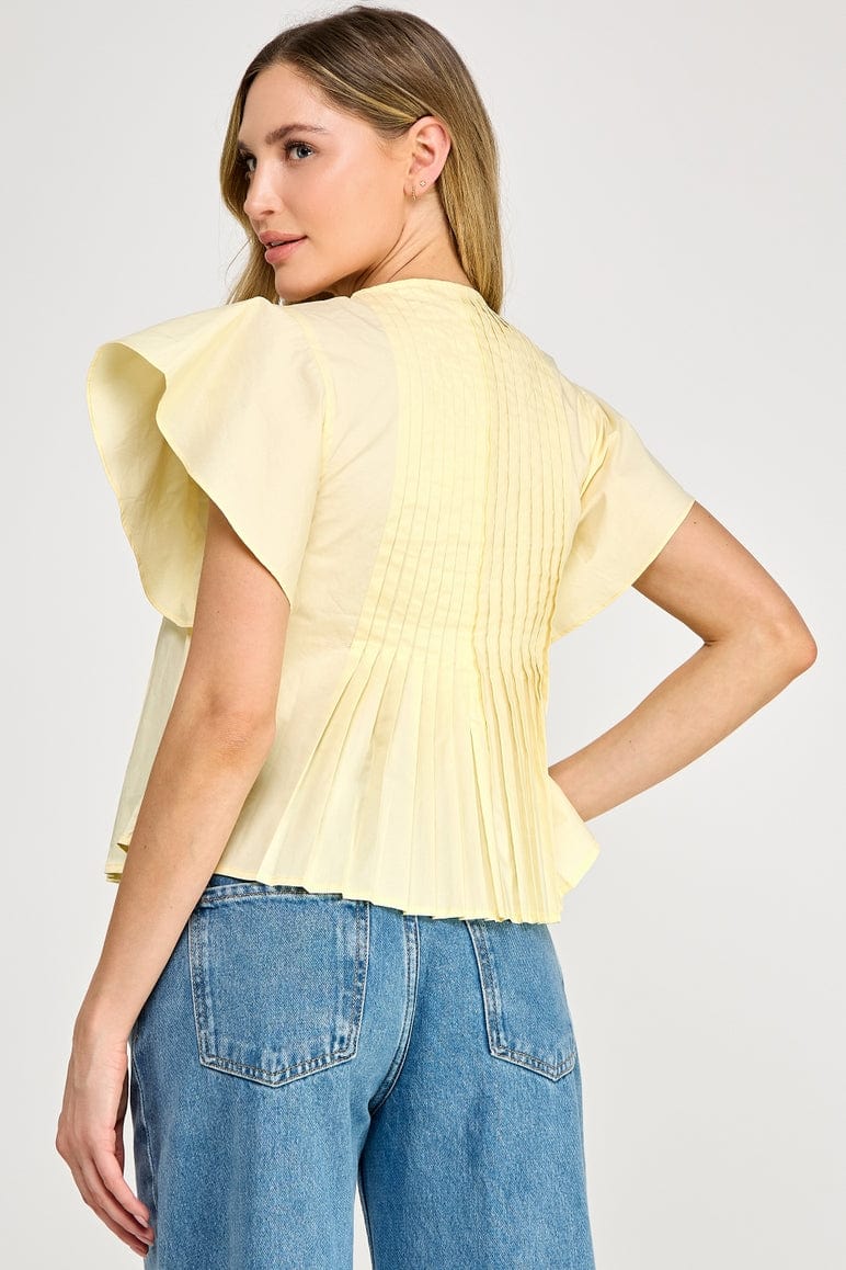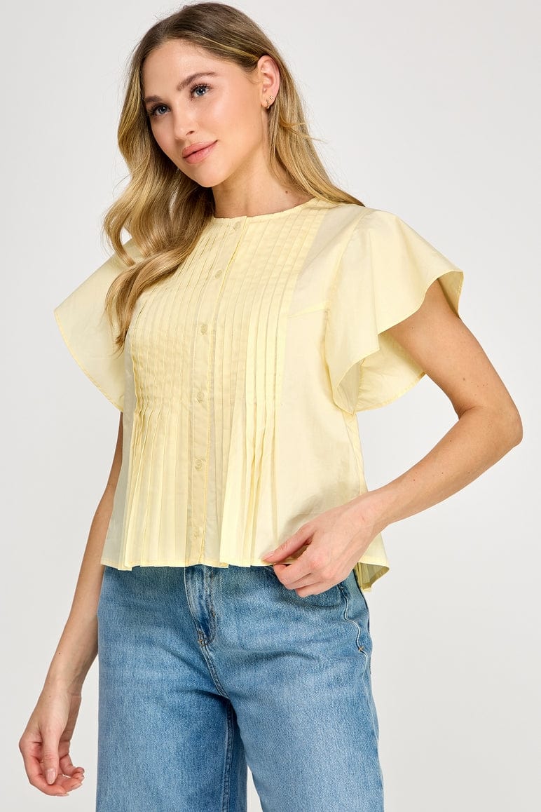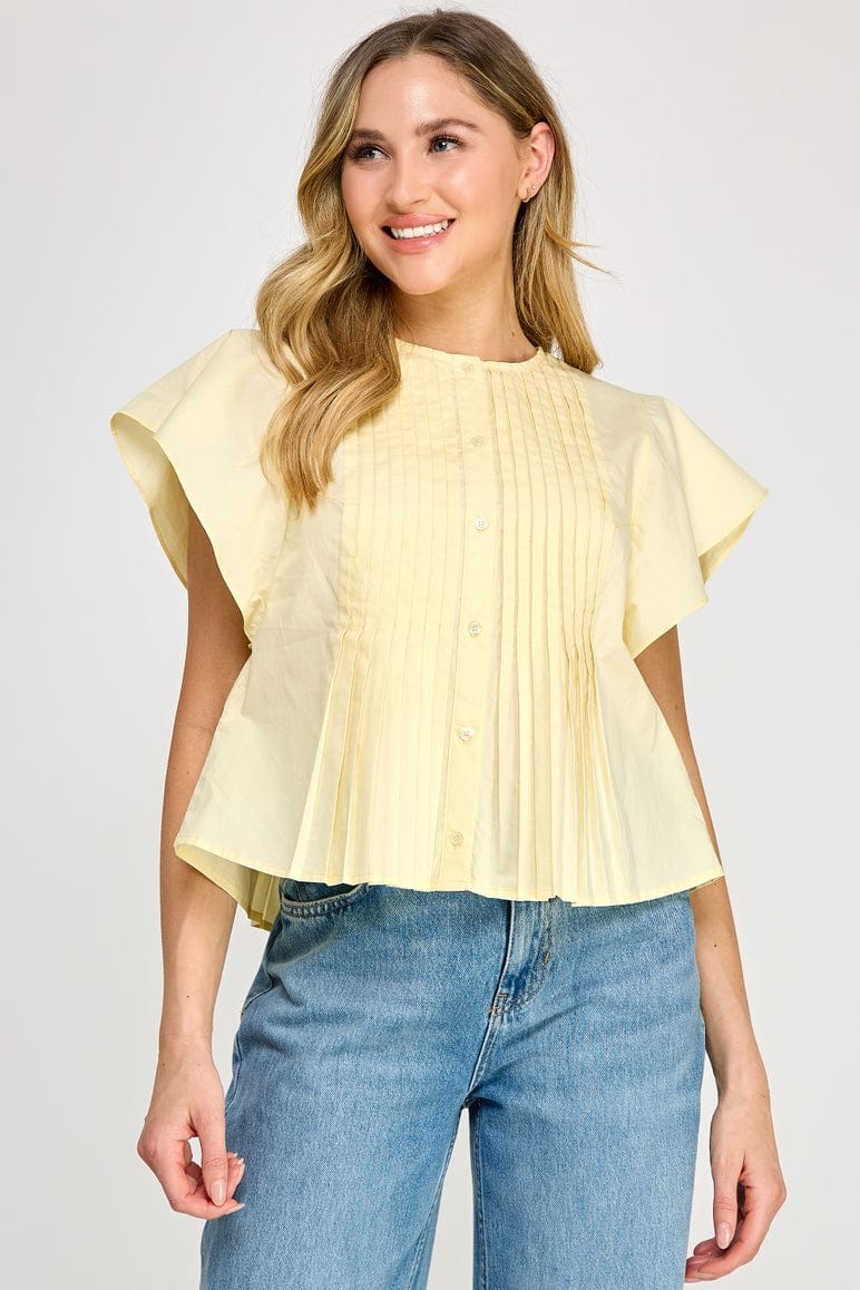 The flutter sleeves kaftan top offers a relaxed, boho-chic style with its flowy design and light, breezy fabric. The fluttering sleeves add a playful, elegant touch, making it perfect for casual outings or beach days. Pair it with jeans, shorts, or a skirt for a comfortable yet stylish look that's both versatile and charming. Model is wearing a small Height: 5'9