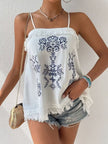 This Miss Sparkling white tank top features blue embroidery and fringe trim on the hem and neckline. Spaghetti straps add a delicate touch for a stylish summer look.