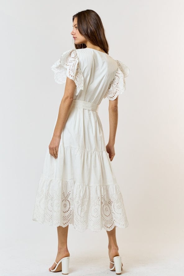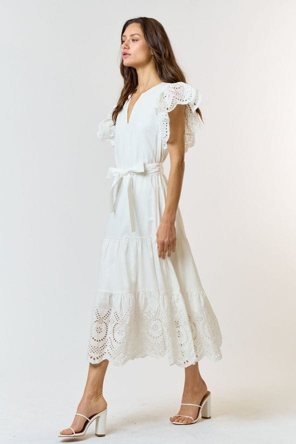 This beautiful Lalavon midi cotton eyelet dress is the perfect blend of elegance and comfort for spring, it offers a relaxed yet stylish fit. The dress features a flattering belt strap that cinches at the waist, enhancing the silhouette. Its tiered ruffle design adds movement and charm, creating a soft, feminine look that is both playful and graceful. - V neckline - Short scalloped flutter sleeves - Removable front tie belt - Tierde - Scalloped eyelet design. 100% cotton.