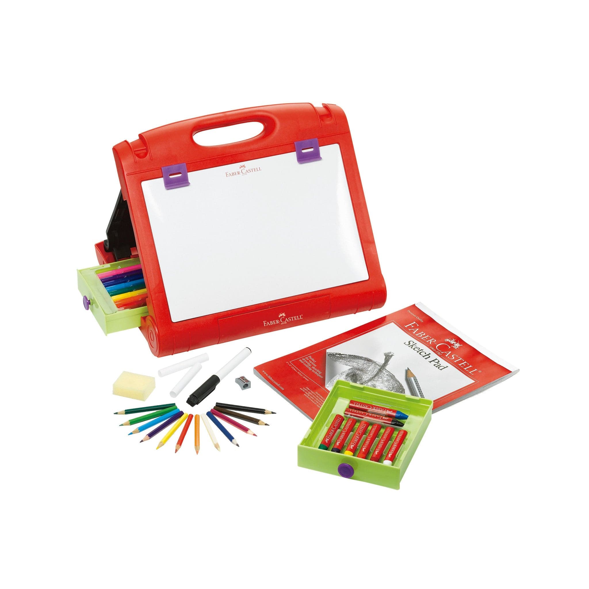 Comes with more than 37 pieces of art supplies! Travel art easel for kids includes Jumbo Beeswax Crayons, mini Colored EcoPencils, markers, chalk, dry erase marker with incorporated eraser, sharpener, sponge and sketch pad