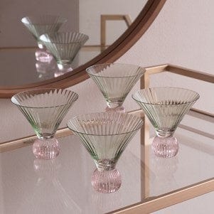 Elevate your martini game with Beatriz Ball's Glass Venice Martini Set. These beautifully fluted glasses in lustrous green and pink add a touch of sparkle to any tablescape. Hand painted with a watercolor effect, each sip is enhanced with brilliance. Exclusively designed for Beatriz Ball. Hand wash for long-lasting use.