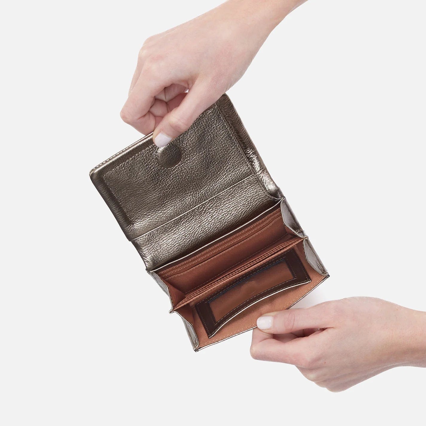 The Hobo Lumen Medium Bifold Compact Wallet offers a sleek and stylish design with an exterior zip pocket, soft shape, and organized interior. This wallet is the ideal choice for those looking for minimalism and a smaller bag - measuring 5" W X 4" H X 1" D with brushed antique brass hardware and a hidden magnet closure. The interior features two compartments, two slip pockets, an ID window, and six credit card slots, while the exterior back includes a slip pocket.