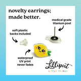 The delightful novelty earrings are designed for all-day comfort with hypoallergenic titanium posts. The vibrant print will never fade & earrings are 100% waterproof! • Medical grade pure titanium post • Nickel-free & hypoallergenic • Vibrant UV ink on clear acrylic • Fade-proof and waterproof • High gloss protective finish • Soft plastic backs included • Glue pad contains nickel-free stainless steel • Handmade with love in New Orleans, LA