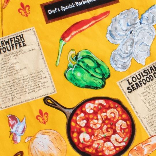 Youngberg & Co Inc Yellow Louisiana Recipe fabric design is quilted and includes recipes for Seafood Gumbo and Crawfish Etouffee with the most popular “specials of the day” on black boards. Crawfish, crabs, oysters, shrimp and all the ingredients you find in these dishes are highlighted.