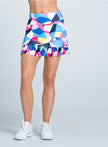 Rule the court in this vibrant skirt, featuring an abstract pickleball paddle pattern with bold color blocking. It’s all done on the Lucky in Love signature scalloped-edge pleat border.