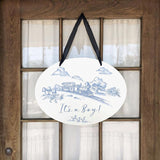 Reversible boy/girl door hangers featuring Maison Nola Storyland Toile designs. Durable 1/4" PVC, water-safe, UV-protected for indoor/outdoor use. Perfect baby decor.
