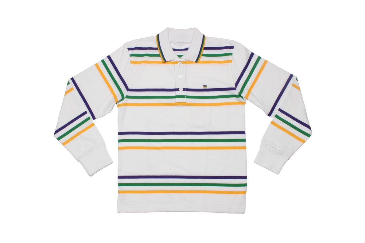 Celebrate Mardi Gras with this stylish kids white long sleeved with purple, green and gold small infinity stripe shirt. This shirt features thin purple, green and gold solid stripes. Small lines of purple, green and gold are around the edge of the collar.