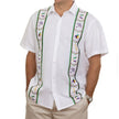 White shirt with purple, green, and gold embroidery.