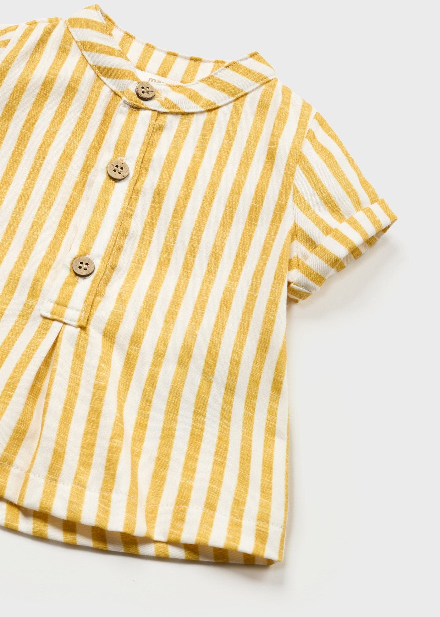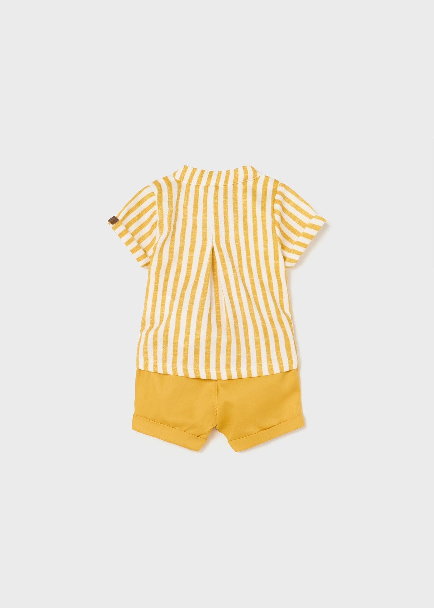 Cute banana colored matching short sleeved mandarin collar shirt and bermuda shorts set for baby boy. Shirt has button fastenings down the front. Made from 100% cotton fabric in a striped pattern. Bermuda shorts have an elasticate waistband for a better fit. Made from 100% cotton fabric. Upturned hem with a mock, decorative pocket on the back.