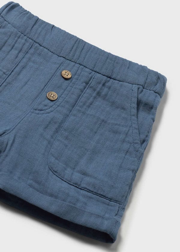 Baby Bermuda shorts. Adjustable elastic waistband with interior buttons for a better fit. Flowing bambula fabric. Cuffed hem detail. Functional front pockets.