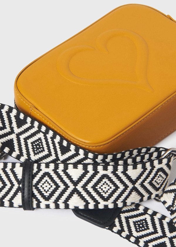 This Mayoral Crossbody Bag is perfect for any stylish young girl. It features a heart imprint in a mustard color. It has a convenient and secure strap for easy carrying. With its fashionable look, your little one will be turning heads in no time.