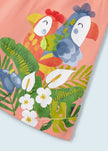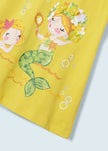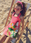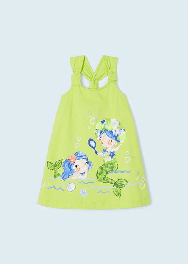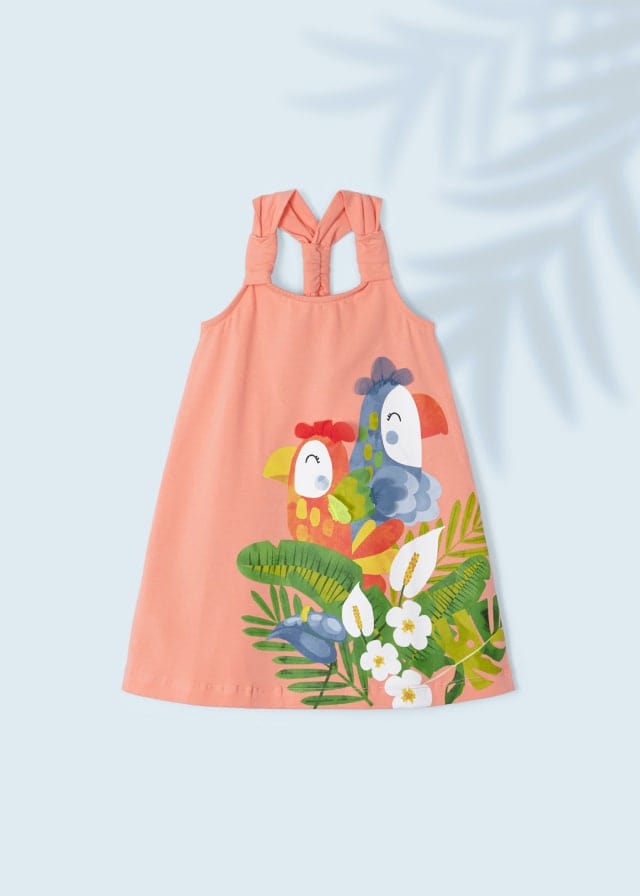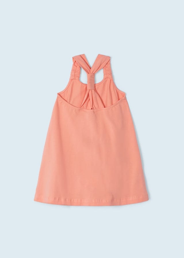 ECOFRIENDS garment, contains sustainable cotton Dress with braces for girl. Round neckline. Designed with opening on the back. Patterned design.