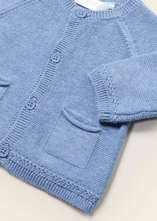 ECOFRIENDS garment 100% sustainable cotton. Long sleeved Cardigan for newborn. Button fastenings down the front. Functional front pockets.