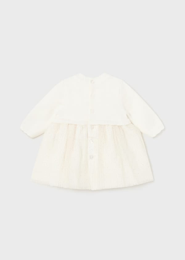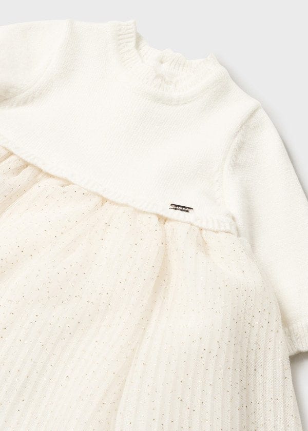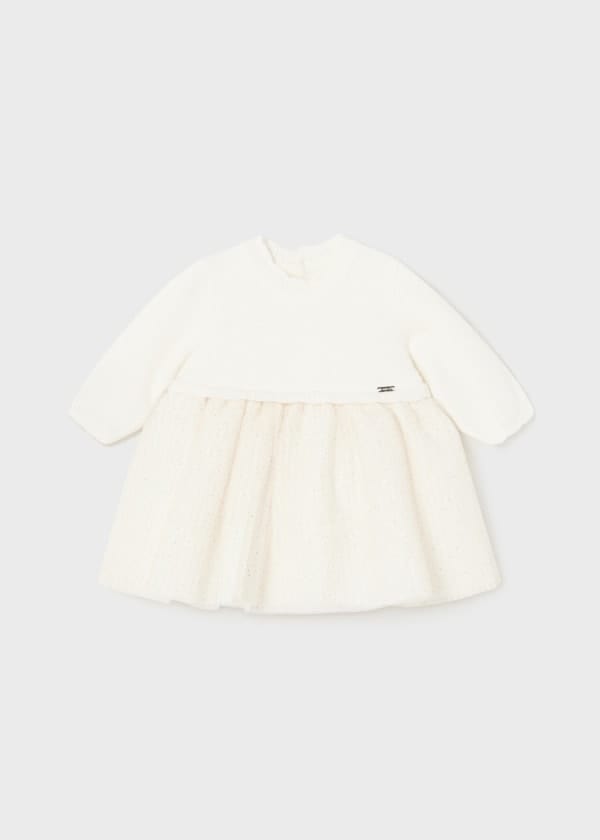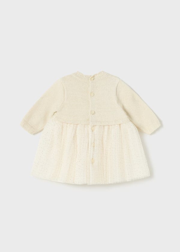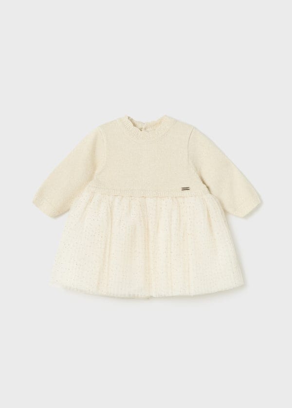 This Mayoral Knit & Tulle Dress is designed for baby girls. The outer layer features a combination of 76% Polyester, 17% Viscose, and 7% Polyamide, and the inner lining is made of 100% Cotton. The dress features a sweater top and a tulle bottom for a fashionable look and lasting comfort.