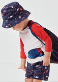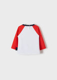 ECOFRIENDS garment contains recycled polyester. Long sleeved T-shirt with contrasting colored sleeves for baby boy. Contrasting color round neckline. Snap button fastening on the back to allow the garment to be put on easily. Made from soft elasticated cotton fabric. Decorative elements: design on the front.