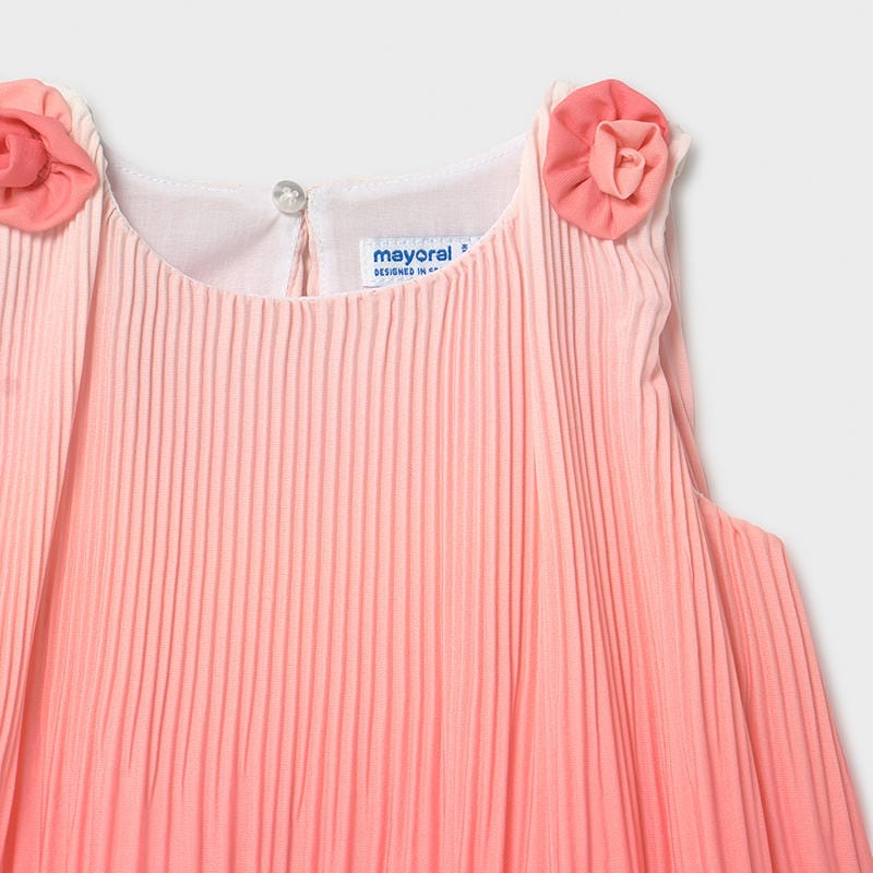 Short raglan sleeve Dress for baby girl 6 to 36 months. Round neckline. Single button fastening. Elastic, flowing fabric for maximum comfort on a day to day basis. Pleated design. Decorative elements: floral appliques.