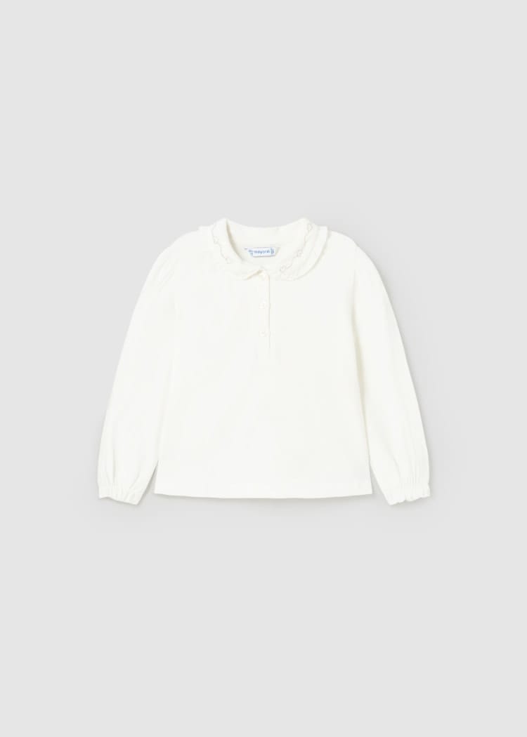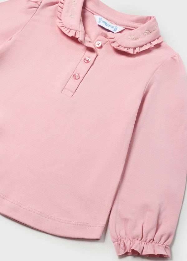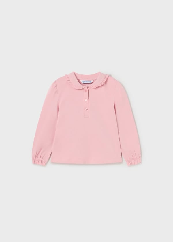 This Mayoral Ruffle Collar Long Sleeve Polo Shirt for Baby Girl is made from quality material, with 95% Cotton and 5% Elastane for a comfortable fit. It features a pretty ruffly collar detail that adds a charming touch to her wardrobe. Perfect for everyday dressing!