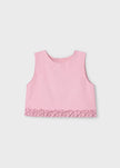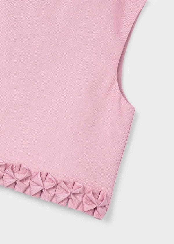 Sleeveless top for girls with a round neckline. Fastens with snap buttons at the back. Adorned with bow appliqués.