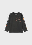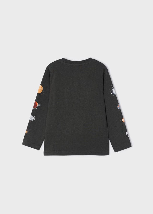 Long sleeve crew neck shirt with planets printed on sleeves and front.