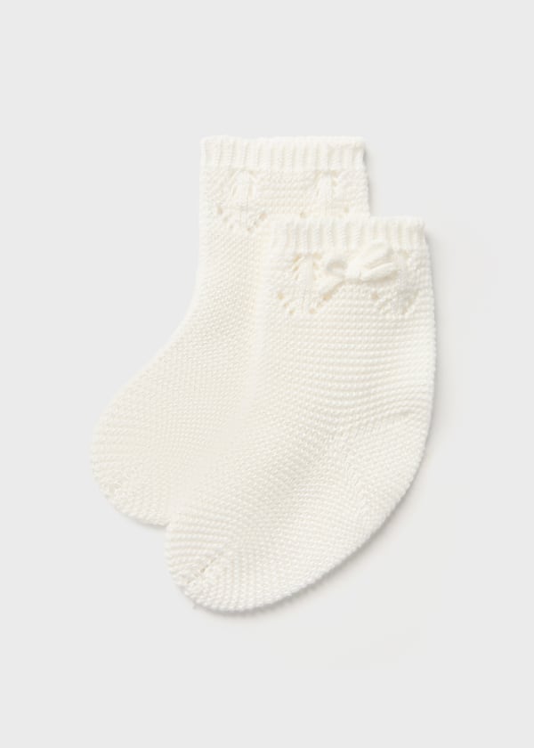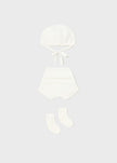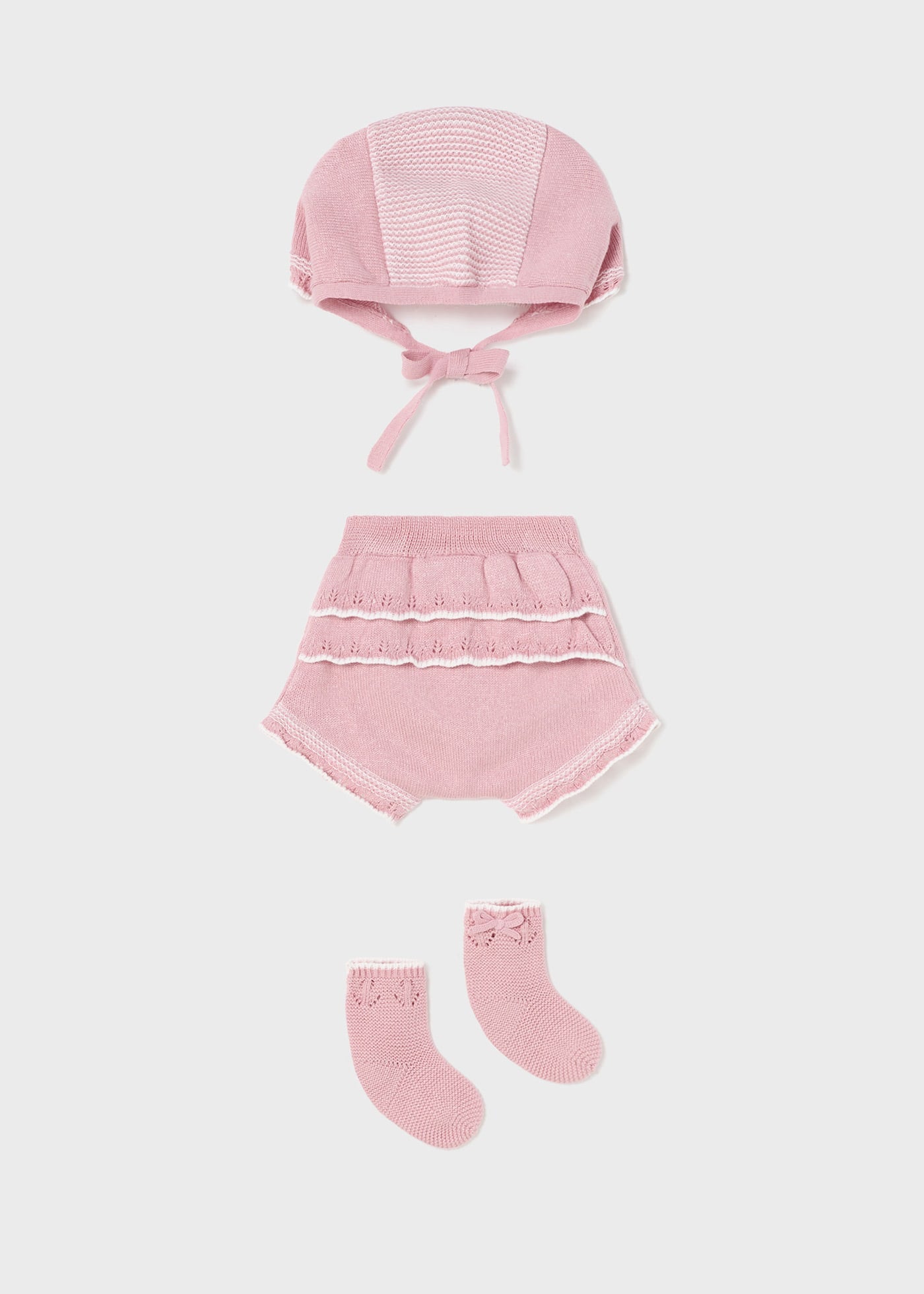 Three piece set for baby girl. Exclusive knickers for baby girl. Made using fine knit fabric that is soft to the touch. Decorative elements: decorative ruffles. Bonnet for baby girl, perfect as an accessory to complete the look. Made using fine knit fabric that is soft to the touch. Socks for baby girl. A perfect accessory to complete your look, giving it a different touch.