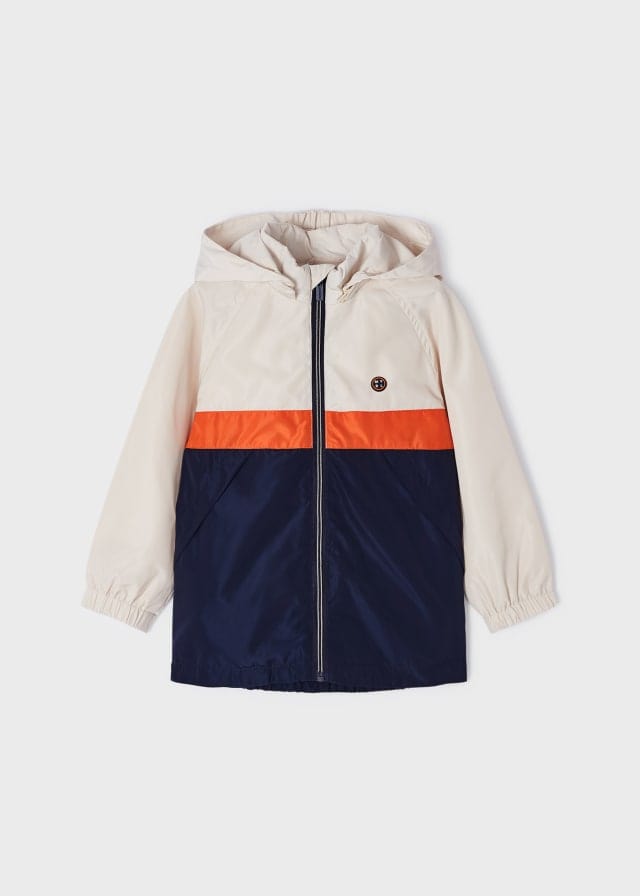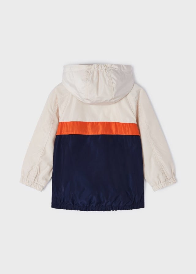 Long sleeve windbreaker for boy. Detachable collar for an adaptable design. Detachable hood. Front, central zip fastening. Elasticated bottom cuffs for a better fit. Side pockets. Two-color combination.