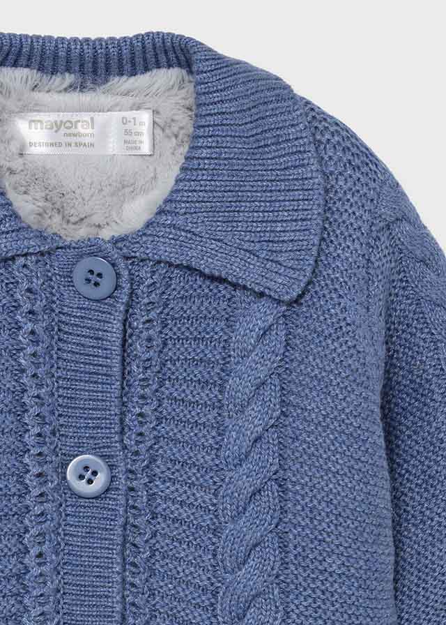 Long sleeved Woven knit jacket for Newborn boy 0 to 18 months. Button fastenings down the front. Woolen Inner lining.