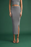This Miou Muse silver metallic knit maxi skirt blends comfort and style, perfect for cocktail or day parties. Made with viscose, nylon, and polyester for a soft, durable fit.