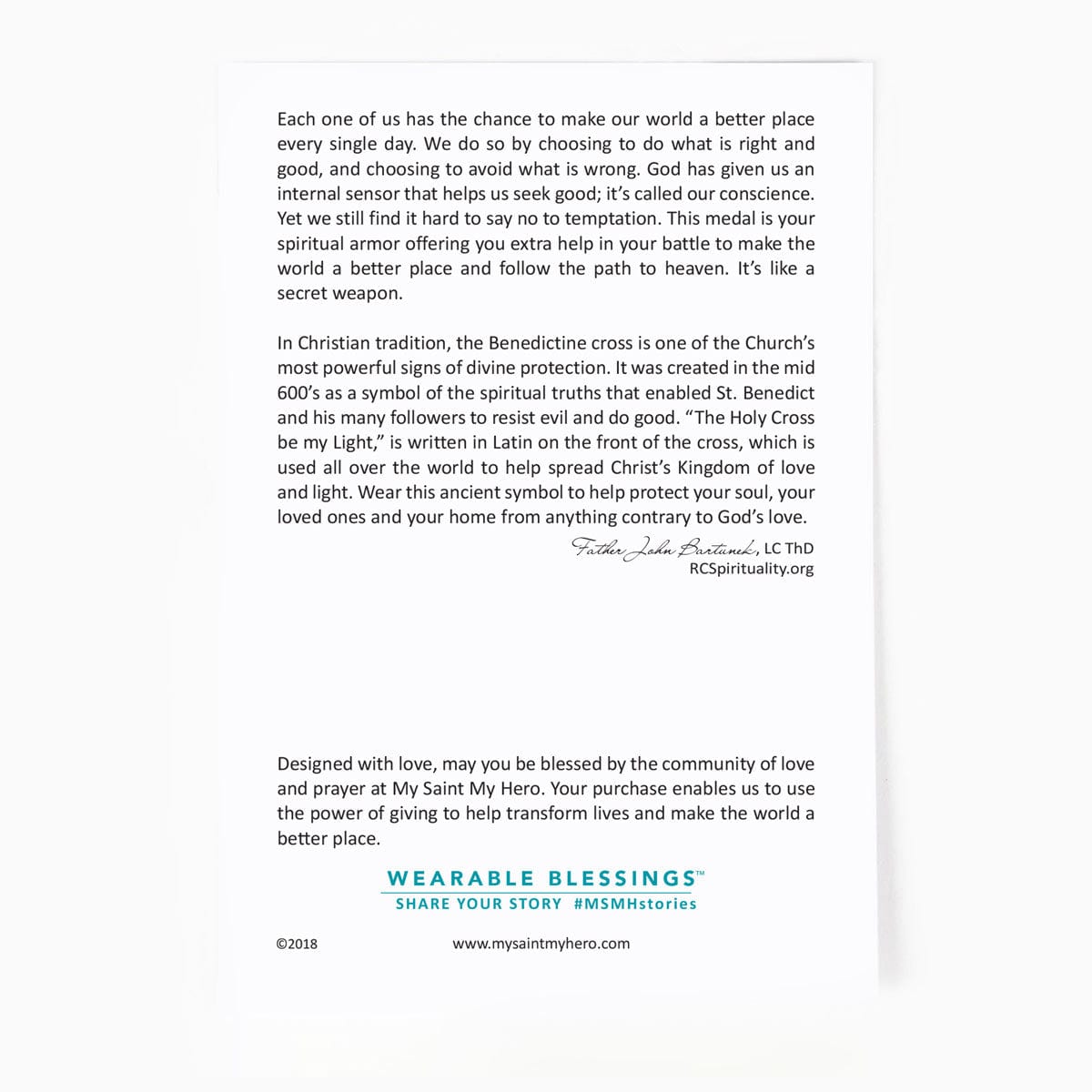 The Benedictine cross is the most powerful symbol of protection. Wear this petite St. Benedict necklace as a reminder that you are protected by God's great army of Angels and Saints. This Benedictine medal is a prayer for strength in times of temptation, for peace among ourselves and among nations, and a petition that we may "walk in God's way, with the Gospel as our guide."