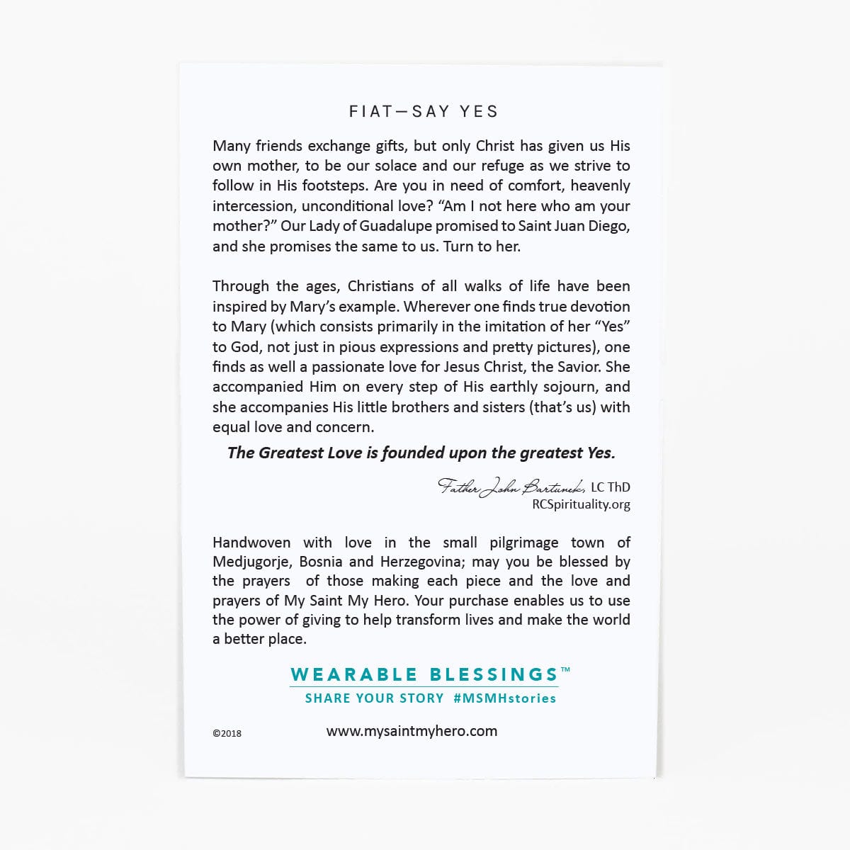 Wear this bracelet on your wrist and feel the tender love of Our Blessed Mother that is woven into each knot through prayer. Following her example of love and prayer, may you too say YES to God.