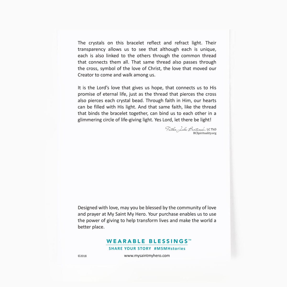 Light allows us to look ahead and see new possibilities. Wear this bracelet as a reminder that we are all connected by God's great love and life-giving light. Together let's proclaim, "Let there be light!"