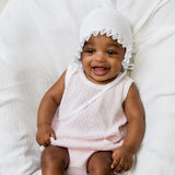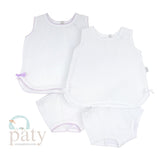 White diaper set includes sleeveless top with white bows on each side and matching diaper cover bottoms. Paty Knit, Made in Houston, Texas.