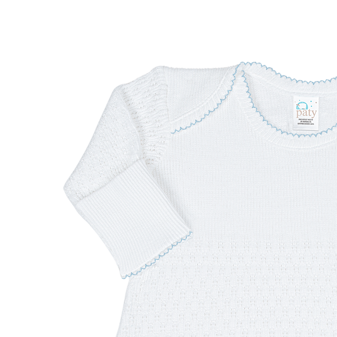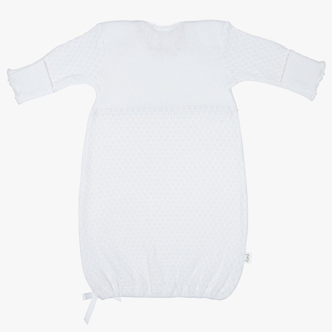 White newborn gown with blue piping. Soft and perfect for little ones.