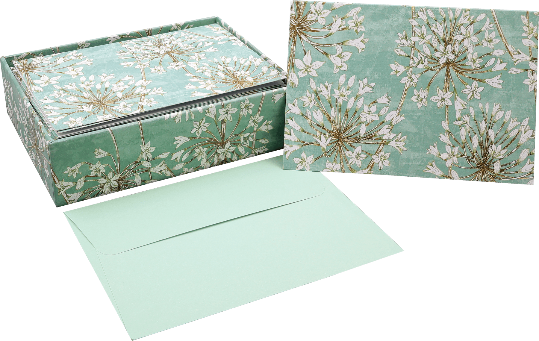 Elegant note cards feature a display of delicate white Allium Blossoms in full bloom, artfully arranged against a softly textured background.