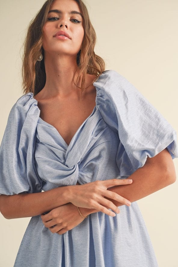 Miou Muse Puff Ballon Sleeve Knot Front Detail Dress in Blue