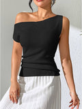 Indulge in luxury with the Rosa Clothing One-Shoulder Sleeveless Knit Top in Black. Perfect for any occasion, this ladies' vest top adds a stylish twist to your wardrobe. Dress it up or down for a versatile and sophisticated look. Whether it's for a holiday or everyday wear, make a statement with this elegant and chic top.