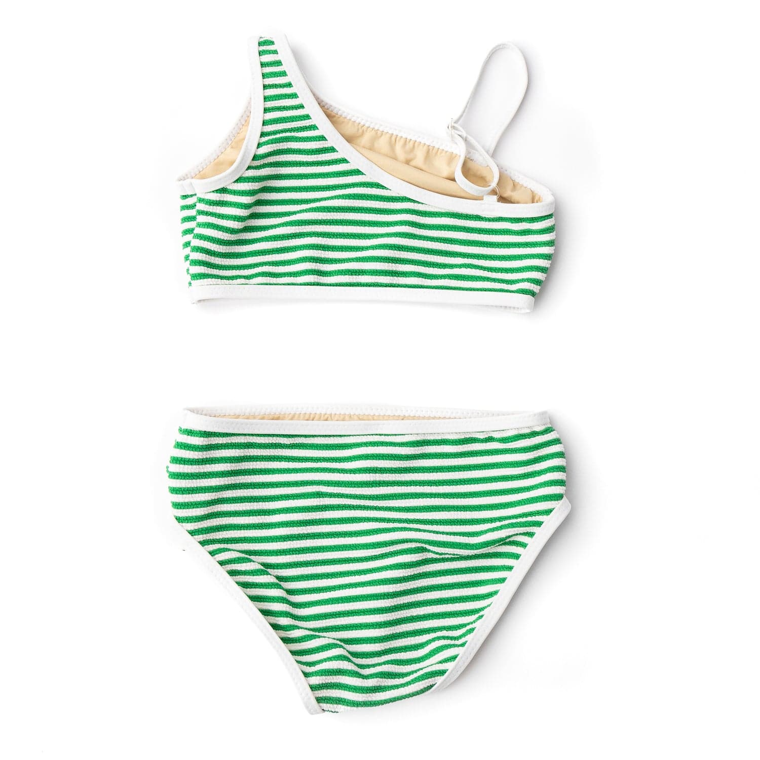 The Green Stripe Girls Ribbed One Shoulder Two Piece Swimsuit combines modern style with chic, sporty details. Featuring a textured ribbed fabric with eye-catching white trim and a stylish one-shoulder design, this swimsuit is perfect for girls who love to stand out in the sun. The adjustable straps ensure a custom, comfortable fit, while the full cut coverage provides support and confidence for all-day wear.